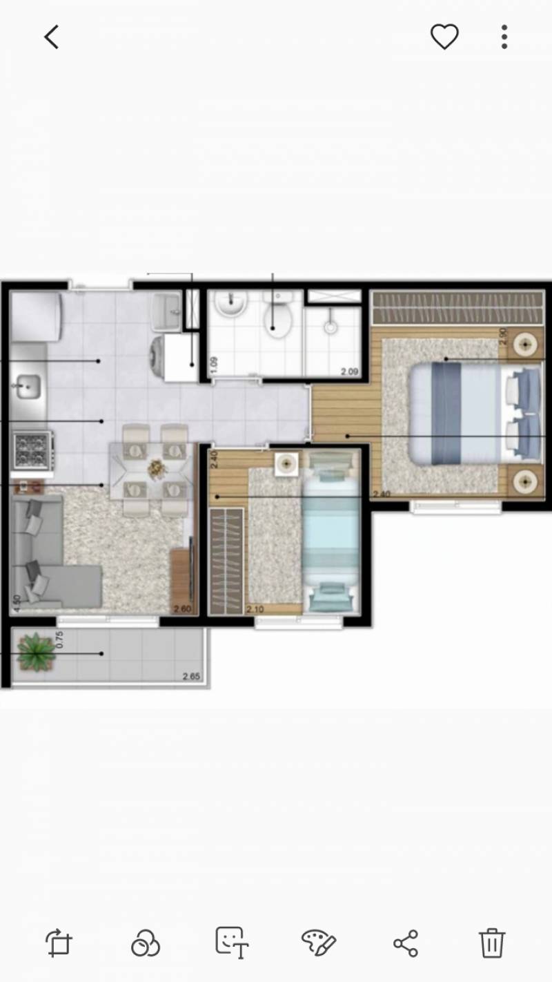 Apartamento de 2 dormitórios com varanda, metragens de 34m², 35m² e 43m²