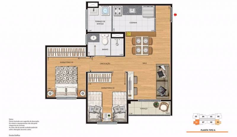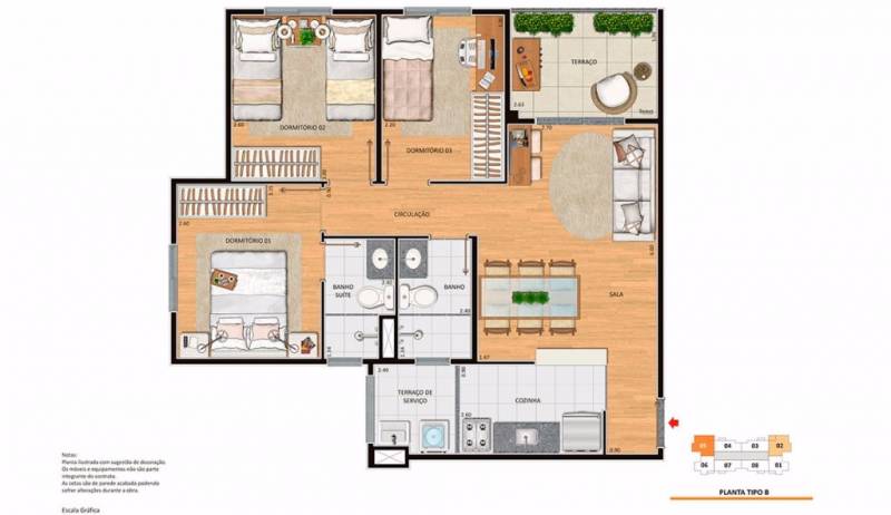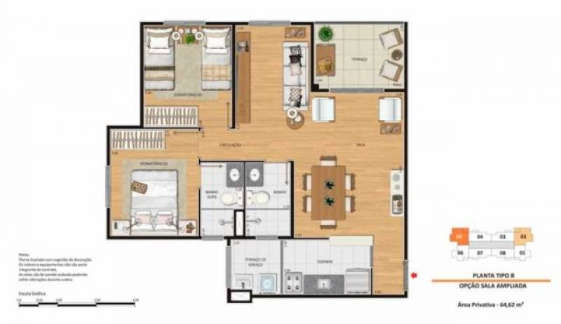 São 64 m², 3 dormitórios e uma suíte, todos com vaga de garagem coberta;