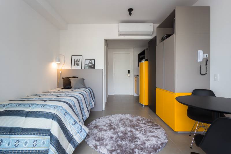 Moderno apartamento, ideal para ser compartilhado, com 2 camas box de solteiro, terraço e banheiro privativo, excelente distribuição. Pronto para morar, mobiliado, equipado com geladeira, cooktop, forno microondas e ar condicionado 12.000 btus. O empreendimento possui academia, café, lavandeira e estacionamento com sistema “pay per...