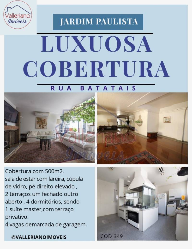 Essa cobertura é simplesmente sensacional, localizada em uma região nobre do Jardim Paulista, na R. Batatais, localização privilegiada e cobiçada, próximo a variados restaurantes, várias atividades comerciais e escolas. Área útil: 500 m2. Sala de estar com lareira | cúpula em vidro | 2 terraços,...