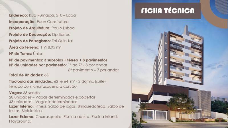 Endereço: Rua Rumaica, 510 – Lapa Incorporação: Econ Construtora Projeto de Arquitetura: Paulo Lisboa Projeto de Decoração: Dp Barros Projeto de Paisagismo: Tal.Quin.Tal Área do terreno: 1.918,95 m2 No de Torres: Única No de pavimentos: 3 subsolos + térreo + 8 pavimentos No de unidades...
